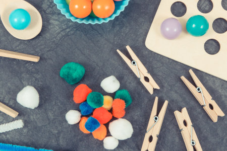 Small colorful pompoms, balls and rubber erasers using for development of kids motor skills, coordination, creativity and logical thinking