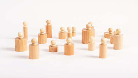 The child was lost in the crowd. A crowd of wooden figures of people surround a lost child. Lost, parents who have lost their parents are a small child. An orphan, a beggar, a lonely kid