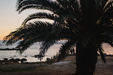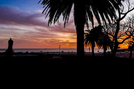 Urban coastal backllight sunset silhouette scene, parque rodo park, montevideo city, uruguay