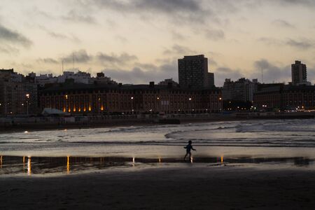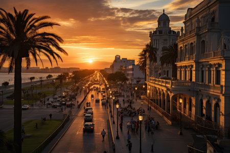 Urban coastal sunset silhouette scene at montevideo city, uruguay