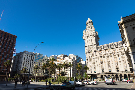 Montevideo / Uruguay, Dec 29, 2018: Independence Square, Plaza Independencia, and exterior view of the Salvo Palace, the tallest building in Latin America for a brief period, when it was constructed.