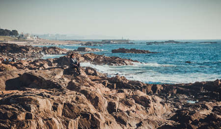 Matosinhos / Portugal - January 9 2019: Rocks and stones on the coastline of Atlantic Ocean. A tourist girl enjoying the view. Beaches of Porto