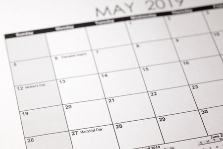 Memorial Day. Monday, May 27, 2019. Memorial Day 2019 in United States of America. Calendar photo shoot with selective focus.