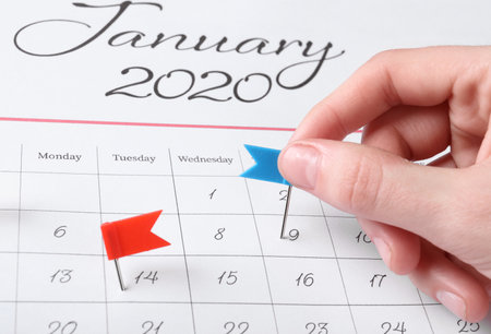 close up of calendar on the red table background, planning for business meeting or travel planning concept