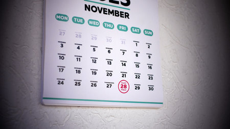 A wall calendar November page with the date of Black Friday 2025 marked on it