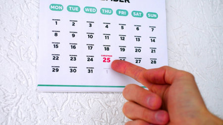 A male hand pointing finger to the date of Christmas 2025 highlighted on a wall calendar (2)