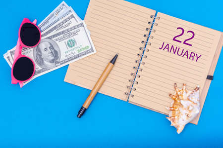 January 22. January 22nd. Travel plan flat design with notepad written date, pen, glasses, money dollars and seashell on blue background. Winter month, day of the year, calendar concept