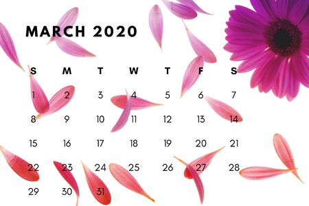 March 2020 monthly calendar, monthly calendar of the 2020 year with flowers illustration march