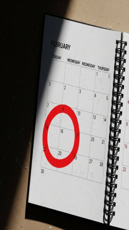 A minimalist composition a February calendar with the 14th and 15th days highlighted. Two bouquets of soft pink roses flank the calendar, one on each side. A simple, light-colored ceramic cup and saucer are placed to the right of the calendar. The background is a smooth, neutral beige, creating a clean and aesthetic. Soft, diffused lighting enhances the gentle colors and romantic mood, making themes of love, celebration, and special occasions.