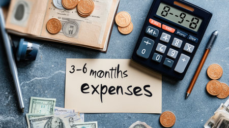 This image depicts a financial planning scene featuring a calculator, cash, and a note indicating 3-6 months of expenses, perfect for illustrating budgeting and financial management concepts.