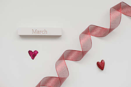 Red ribbon and red heart on white background. 8 March, International Womens Day concept.