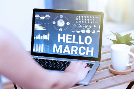 Handwriting text Hello March. Word Written on a greeting expression used when welcoming the month of March Hand Typing On Laptop Beside Coffe Mug And Plant Working From Home.