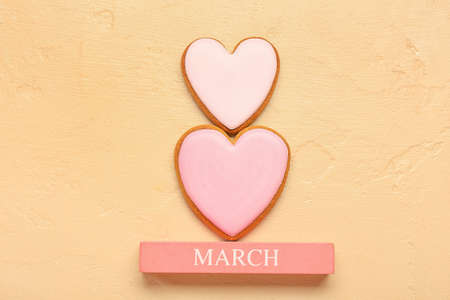 Composition with tasty cookies in shape of hearts and word MARCH on color background. International Women's Day celebration