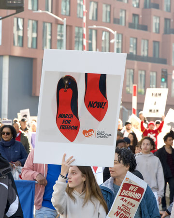 San Francisco, CA - Jan 15, 2024: Participants in Martin Luther King March walking from Caltrain station down 4th St over the bridge then up 3rd St over the bridge to Yerba Buena Garden.