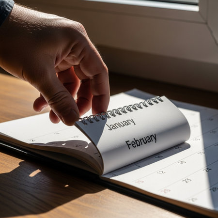 Hand turning a desk calendar from an empty January page to February, symbolizing the passage of time