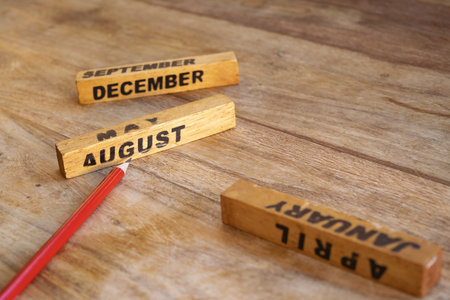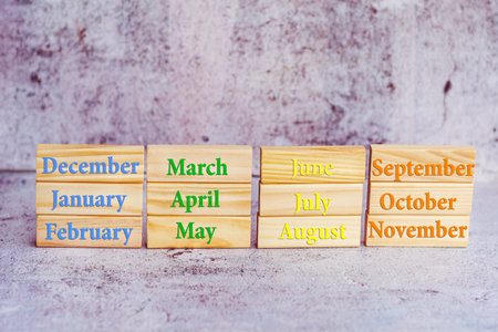 Wooden blocks with the words December, January, February, March, April, May, June, July, August, September, October, November
