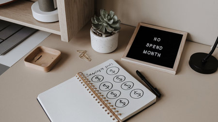 a desk with a notebook displaying saving goals next to a sign that says no spend month and a plant