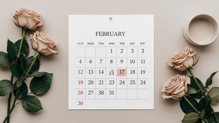 A top-down view of a February calendar with the 14th day highlighted in red. Two blush roses with green leaves are positioned on either side of the calendar. A simple, light-colored ceramic cup sits to the right. The background is a smooth, neutral beige. The composition is clean and minimalist, focusing on the calendar date and the soft beauty of the roses. conveys a sense of romance and understated celebration.
