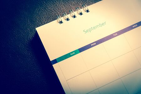 close up of calendar on the black table background, planning for business meeting or travel planning concept