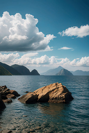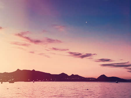 Seascape, travel and nature concept, sea and mountains at sunset