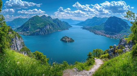 Panoramic photograph of Lake Como, Italy, with mountains and islands. The lake is a deep emerald green color, with a blue sky and white clouds. This aerial view shows buildings on a small island in the middle of the water. The image was captured using a Nikon D850 DSLR camera with an aperture setting of f/4 to create a shallow depth of field. --chaos 30 --ar 16:9 --quality 2 --stylize 500 --v 6.1 Job ID: 0e1f4159-384e-4f01-b55f-f8125460b79b