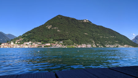 Mount Island in the middle of Iseo Lake during spring, in the North of Italy