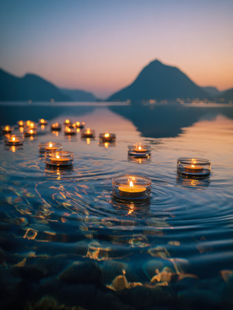 Delicate candles drift on calm lake surfaces as the sun sets behind gentle mountain outlines, evoking tranquility and silent reflection in a soothing scene.