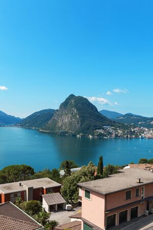 View of the mountains and lake Lugano, Switzerland. Mount san salvatore