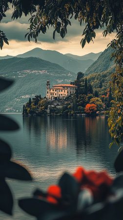 The tranquil waters of Lake Como mirror the majestic mountains, while a historic villa elegantly rests on the hillside, framed by lush gardens and vibrant autumn foliage.