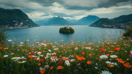A tranquil lake reflects the cloudy sky, with a small island at its center. Colorful wildflowers bloom in the foreground, enhancing the stunning natural scenery.