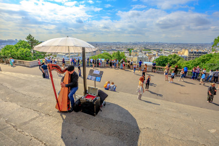 Paris, France - July 3, 2017: skyline above Paris and harp player on the steps of Sacre Coeur de Montmartre. Sacred Heart is a popular tourist landmark. Street artist playing an acoustic instrument.