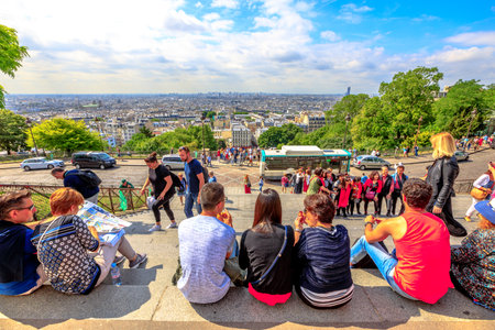 Paris, France - June 1, 2015: Tourists enjoying the beautiful summer view of Paris from Montmartre hill