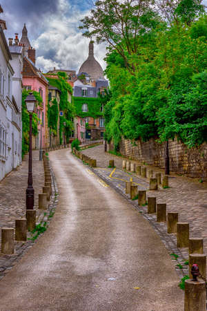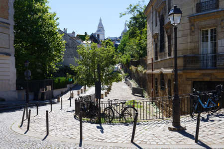 Montmartre district of Paris. Houses on narrow road in Montmartre district of Paris. View of cozy street in quarter Montmartre in Paris, France. Architecture and landmarks of Paris. Postcard of Paris.