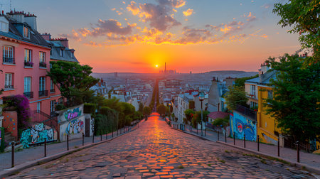 Sunset over a cobblestone street in Paris, France. Summer Olympics.