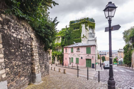 Typical French street in Montmartre district with small houses are located cafes, restaurants and art galleries