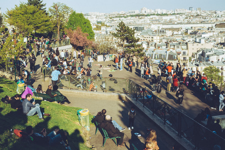 PARIS, FRANCE - JUNE 23, 2016: Summit of the butte Montmartre - highest point in the Paris. Favorite place for numerous tourists, art connoisseurs, local artists, musicians. People admire the beauties