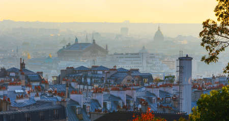 Evening panoramic cityscape downtown of Paris in backlit sunbeam. View from the Basilica of Sacre-Coeur.