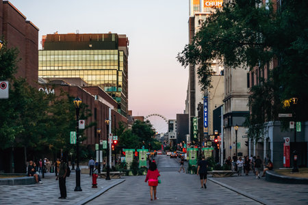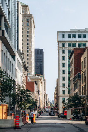 Montreal, Canada - August 14, 2025: downtown cityscape of Rue Saint-Antoine Ouest, highrise views and urban street with heritage facades