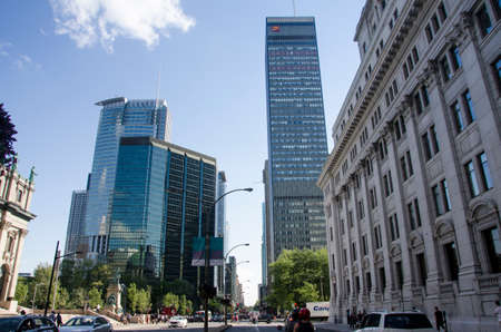 Montreal, Quebec, Canada - 18 July 2016 - Different Syle of buildings (BANK CIBC) in downtown in Montreal in summertime. Canadian lifestyle with cars, people and skyscapers as editorial