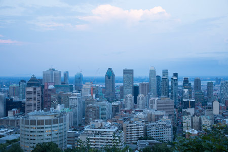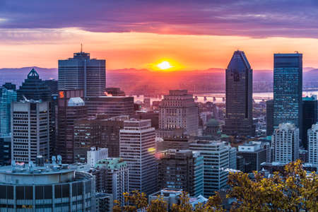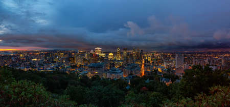 Montreal city skyline panorama at sunset viewed from Mont Royal with urban skyscrapers