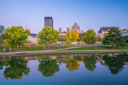 skyline and Colorful trees in historical Old Montreal seen from the Old Port bassin at fall, Canada.