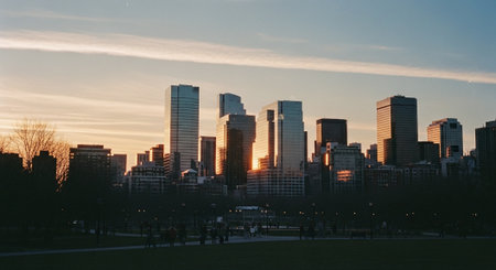View over a modern urban skyline with tall glass buildings at sunset, emphasizing architecture and city life.