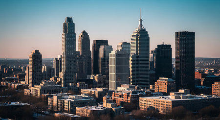 Aerial view of Philadelphia skyline at sunset, Pennsylvania, USA.