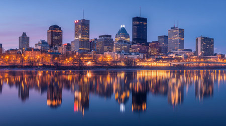 Montreal skyline illuminated at dusk and reflected in the water, Quebec, Canada.