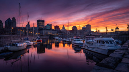 A stunning view of a harbor with moored boats against a vibrant sunset. The colorful sky reflects beautifully in the calm water, highlighting the city skyline.