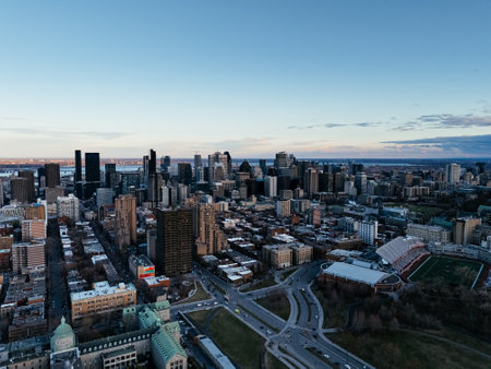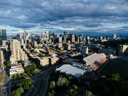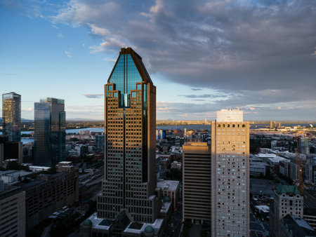 Autumn aerial view of Montreal downtown skyline with high-rise buildings under cloudy sky. g.