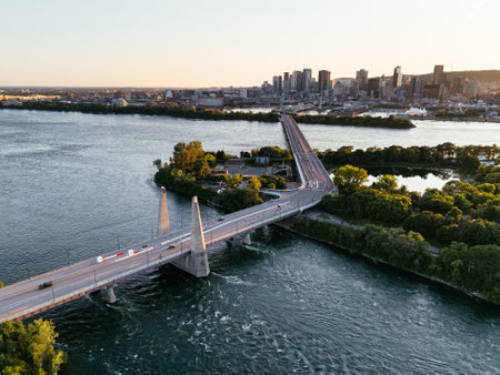 Montreal Canada city skyline at sunset with buildings and river in view.