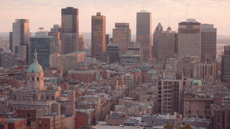 A stunning view of Montreal's skyline at sunset, showcasing a blend of historic buildings and modern skyscrapers, perfect for travel and city exploration themes.