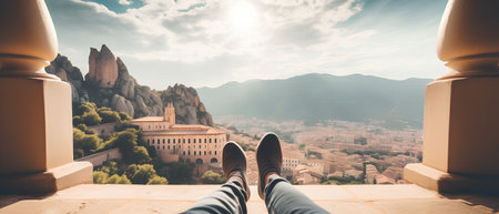 Selfie of man's feet on the balcony of Montserrat, Catalonia, Spain