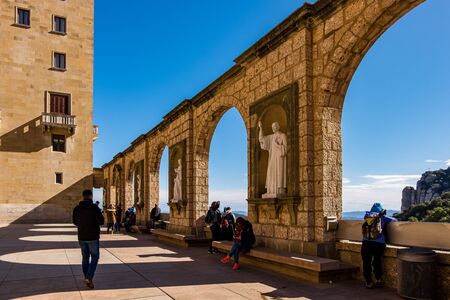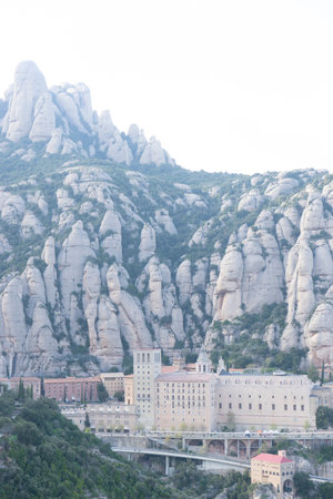 Santa Maria de Montserrat Abbey in Monistrol de Montserrat, Catalonia, Spain. Famous for the Virgin of Montserrat. Benedictine monastery, the spiritual symbol and religious center of Catalonia and a center of pilgrimage for Catholics from around the world